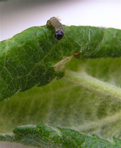 Gąsienica zwójki różóweczki na liściu jabłoni.